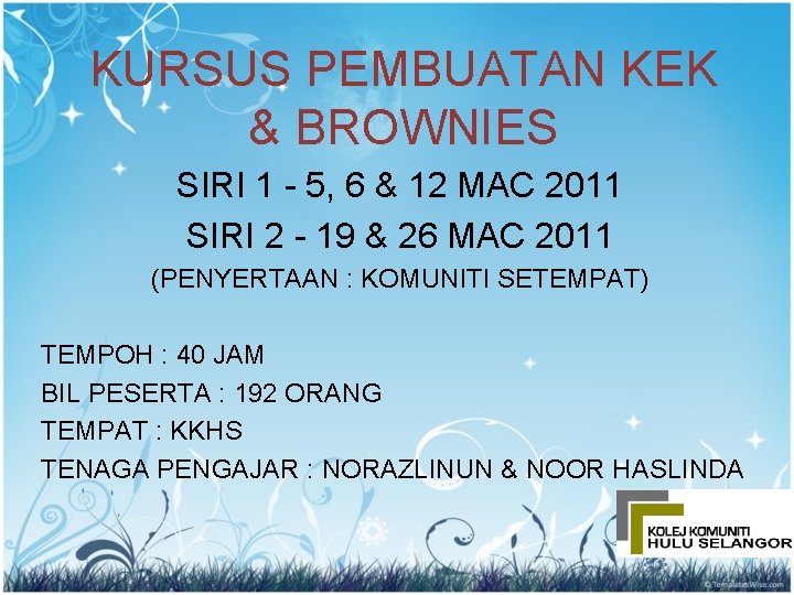 Bagi sesiapa yang berminat untuk mengikuti kursus ini di masa akan datang boleh berhubung dengan pegawai unit kursus pendek kolej komuniti cawangan bandar baharu pn.